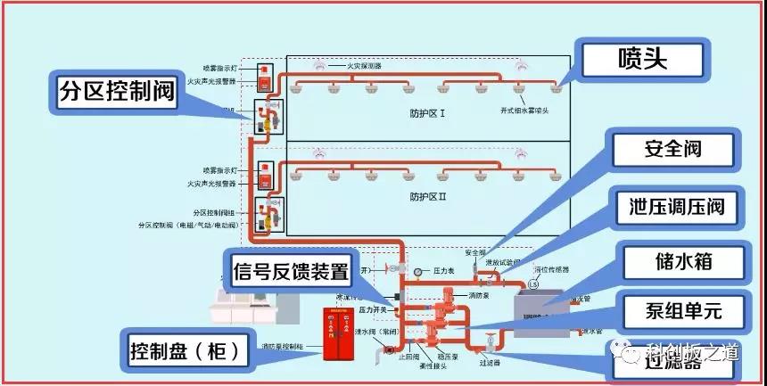 細水霧滅火系統由水源(儲水池、儲水箱、儲水瓶)、供水動(dòng)力裝置(泵組、瓶組)、供水管網(wǎng)、控水閥組、細水霧噴頭(開(kāi)式、閉式)以及火災自動(dòng)報警及聯(lián)動(dòng)控制系統組成。